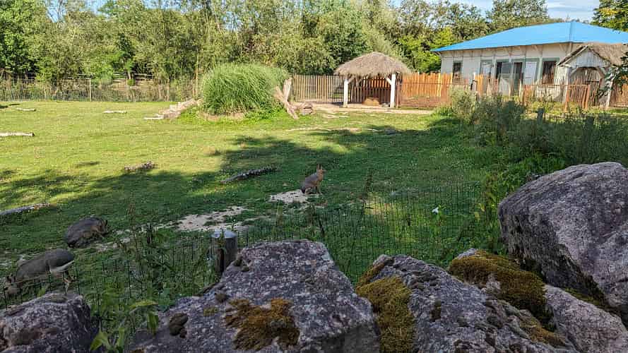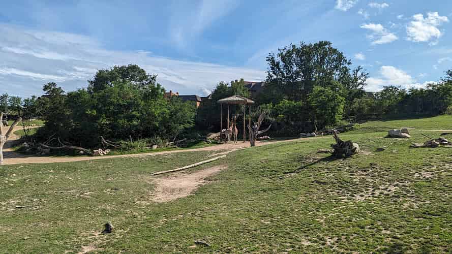 The savannah area is the highlight, with giraffes and rhinos.
