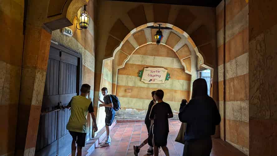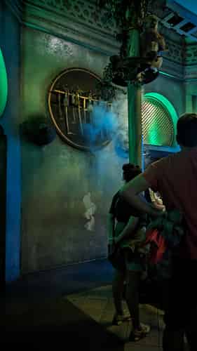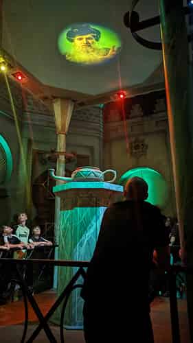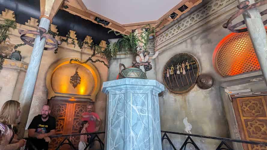 Inside the preshow room, a magic lamp sits on a pedestal.