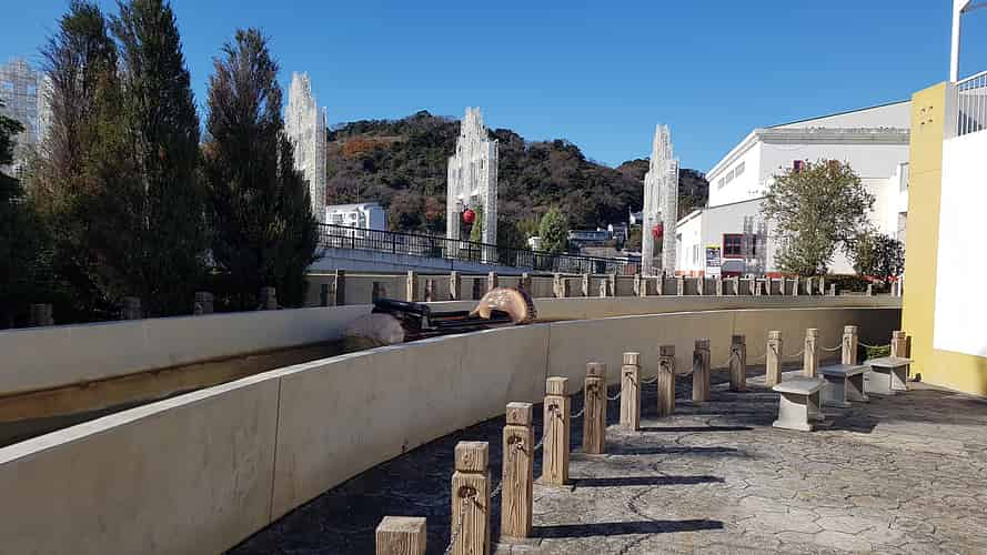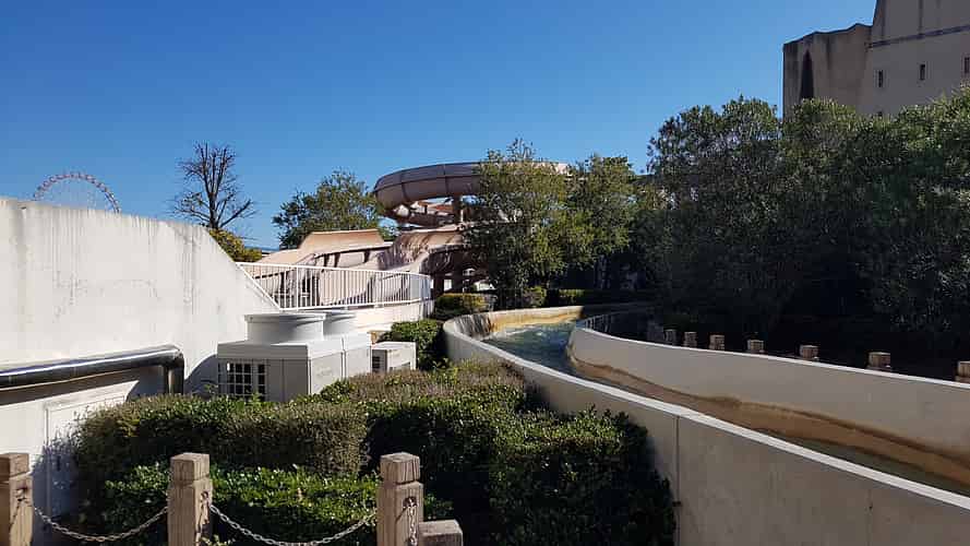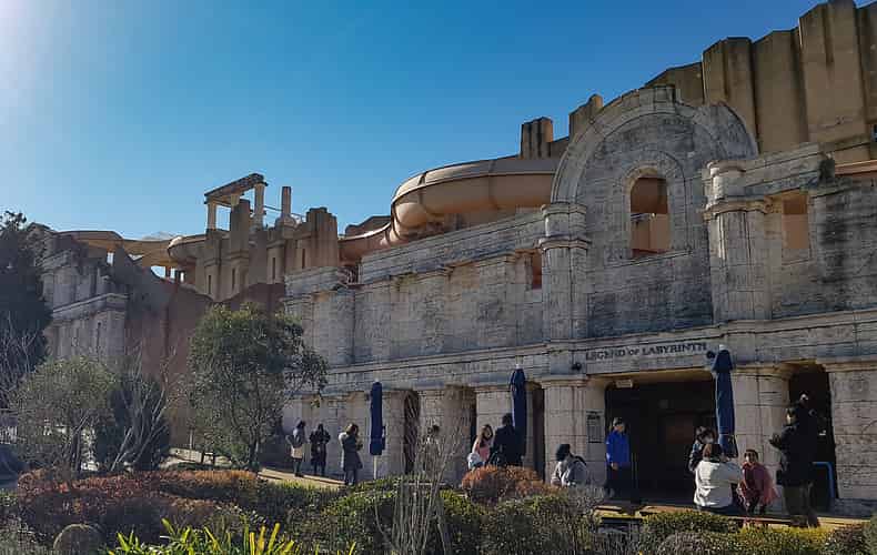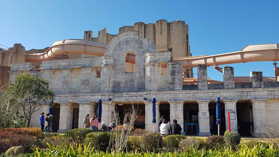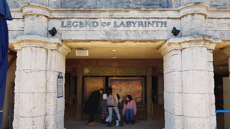 The slide runs along the front of the Legend of Labyrinth show building.