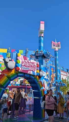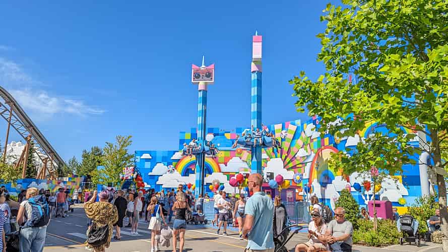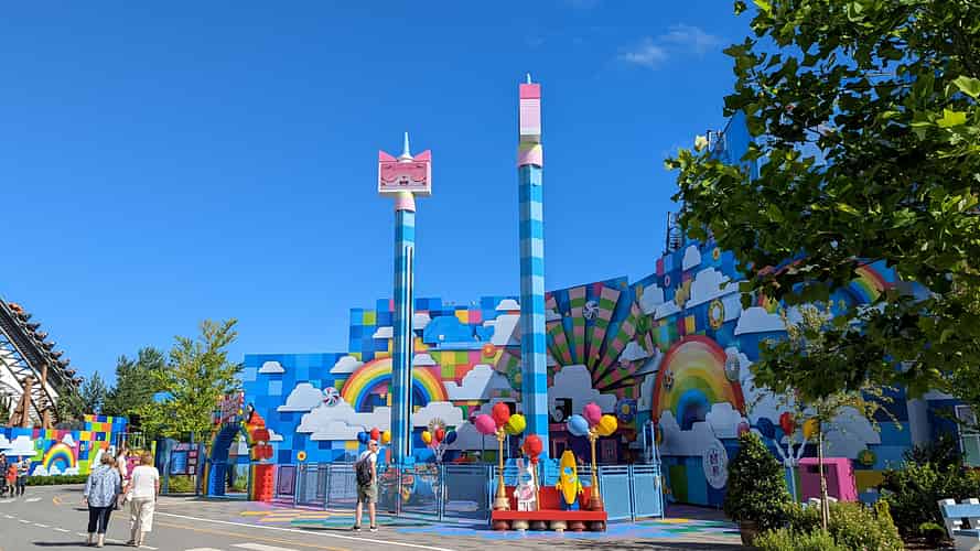 Based on Unikitty from the Lego Movie, you can ride a couple of spinning, bouncing family drop towers from Zierer.
