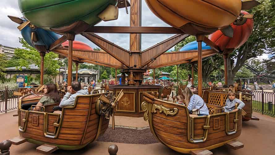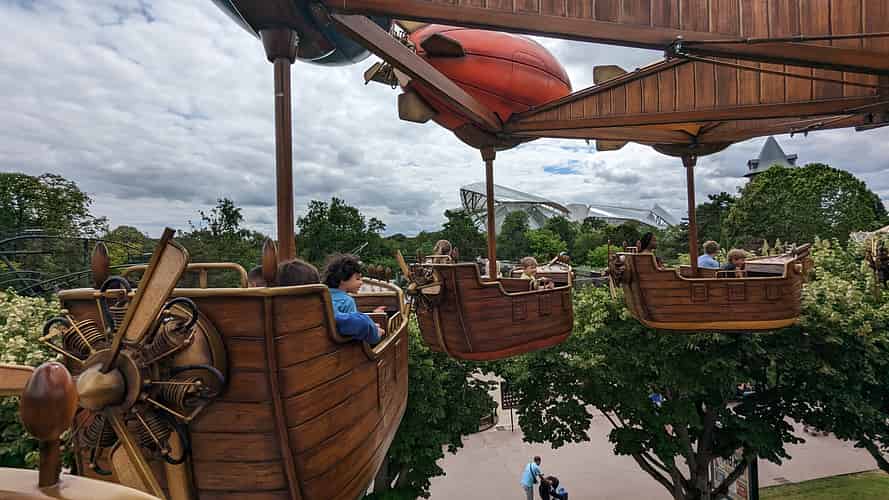 The gondolas are themed like whimsical airships.