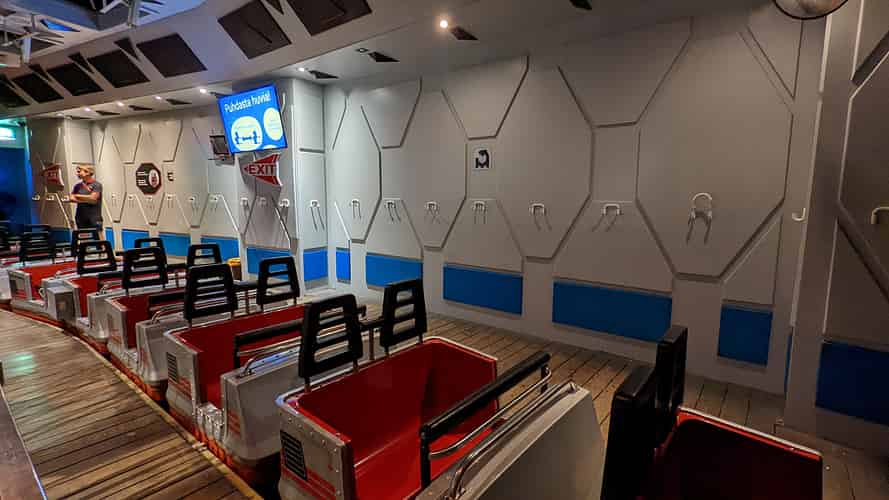 The ride is themed like a "deep space hyperliner" port, much like Disney's star tours.