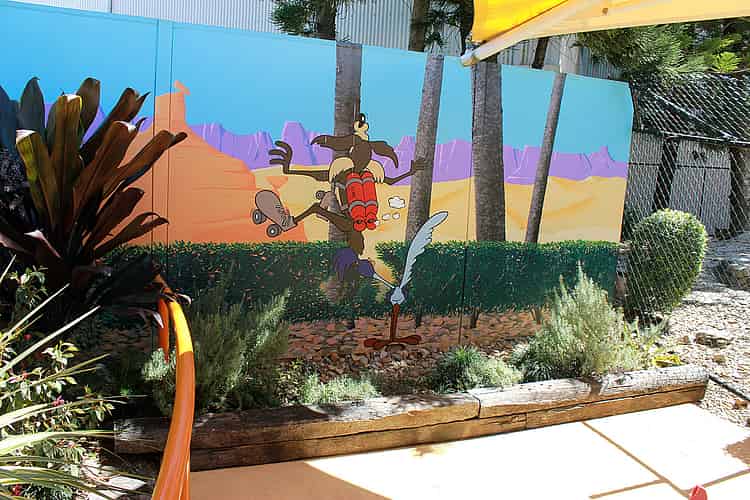 And the final in our series of walls across paths, Looney Tunes River Ride's old queue has of course been converted into a viewing area for Road Runner Rollercoaster with this bright mural.