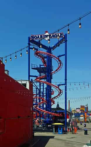 Soarin' Eagle is a "Volare" coaster, a sort of hybrid between a wild mouse and a flying coaster, with sharp turns and barrel rolls.
