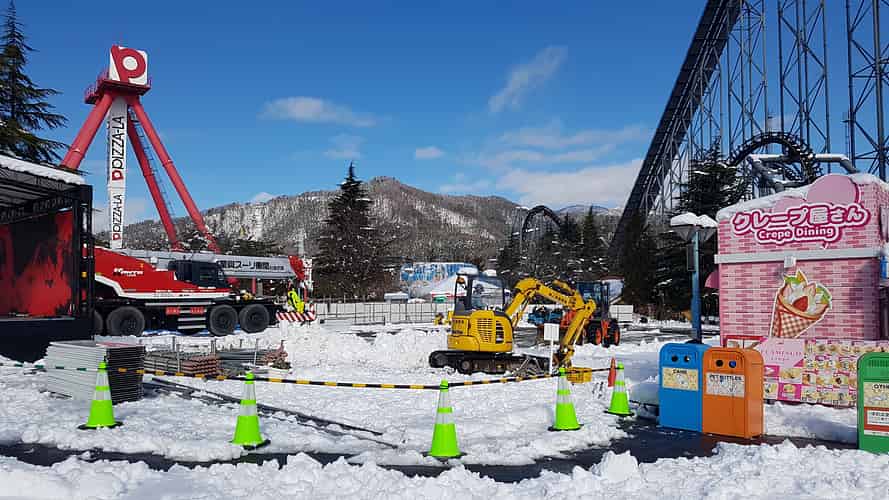 Tondemina, Panic Clock, and the empty plot left by the Mad Mouse, full of construction equipment.