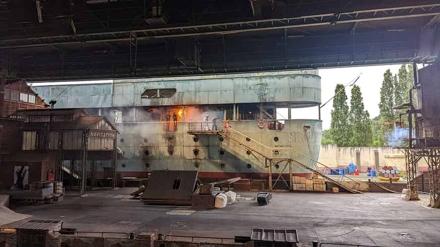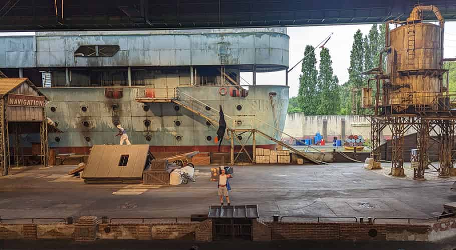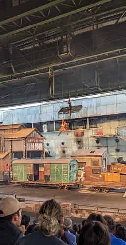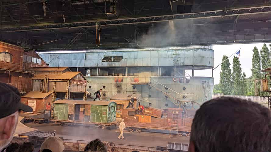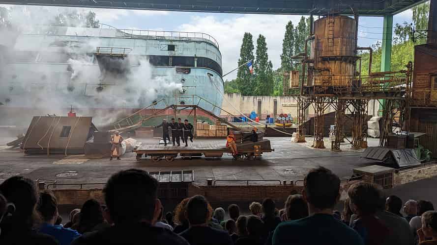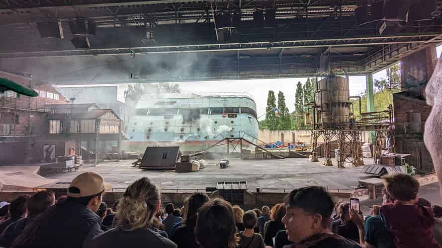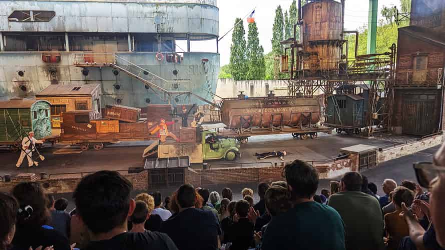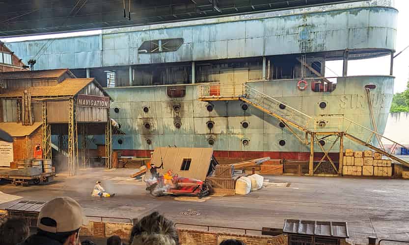 Main basse sur la Joconde (Hands off the Mona Lisa) is the main stunt show at Parc Asterix. A secure shipment carrying the Mona Lisa arrives at the port of Le Havre.