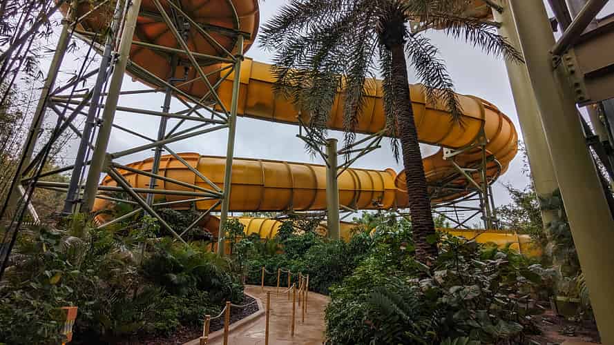 Maku contains three Proslide "Flying Saucer 60" turns, which slope downhill to speed up the rafts.