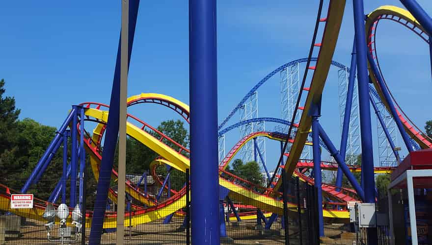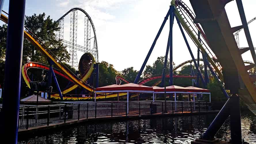 The skyline of Cedar Point. From left to right Millennium Force, the former Mantis, Iron Dragon, Power Tower Corkscrew, Top Thrill Dragster and Magnum XL-200 can all be spotted.