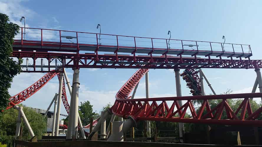 After the twisted horseshoe roll the track drops down under the brake run and station, ready for the 2nd launch.
