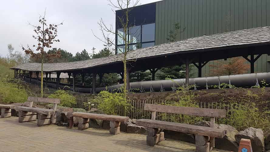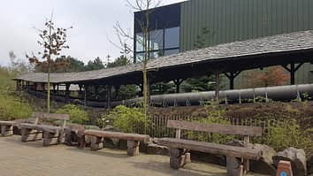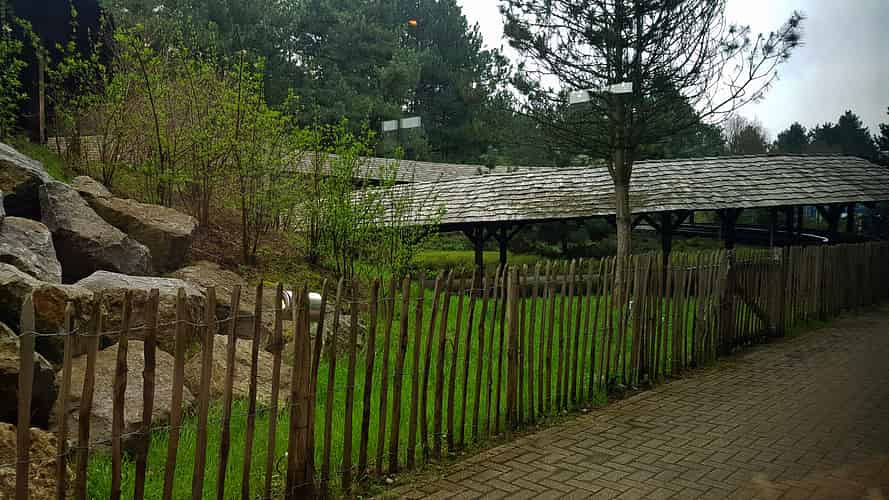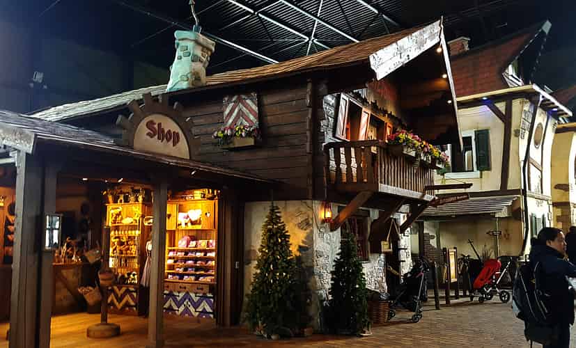 The queue is themed like a Swiss chalet.