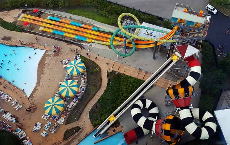 Mega Wedgie drops riders straight down whilst Dive Bomber features interlocked helices. Wipeout is a double funnel slide.