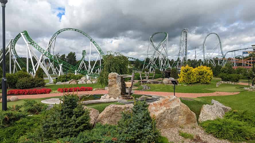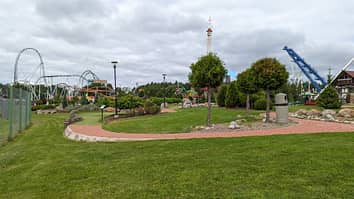Overloooking Typhoon 360, the Minigolf course, and the Pitts Special roller coaster.