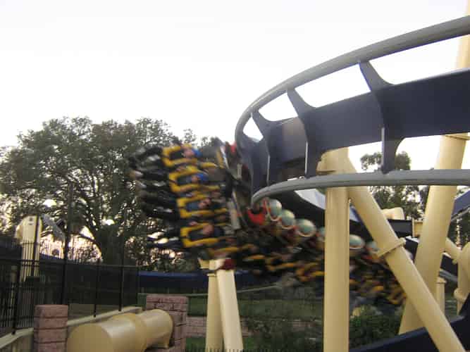 A train negotiating the 3rd inversion, a Zero-G roll, dangling in full view.