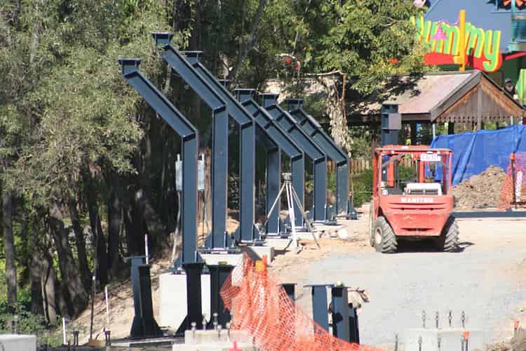 From this perspective the profile of the track on these angled supports can be seen. The track will crest a hill and slope down into the brake run as is typical on Intamin coasters.