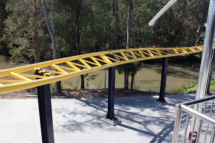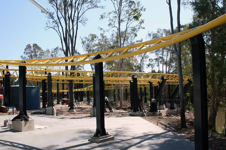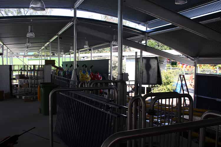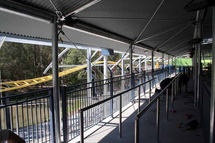 The track passes directly over the queue. Rainfall collected from the shaded area will be stored in nearby tanks for general use around the park.