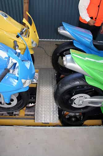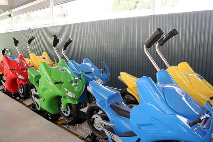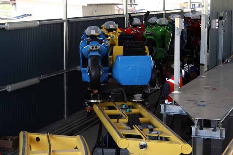 A look at the first of two trains on the coaster. The bikes are life-sized 500cc replicas.
