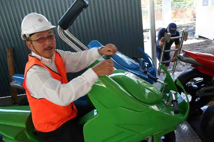 Bob Tan, General Manager Special Projects, demonstrates the seating procedure. As riders lower the front section of the bike into place, the bar will automatically tilt into position behind them.