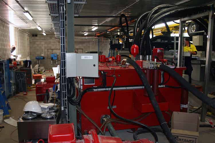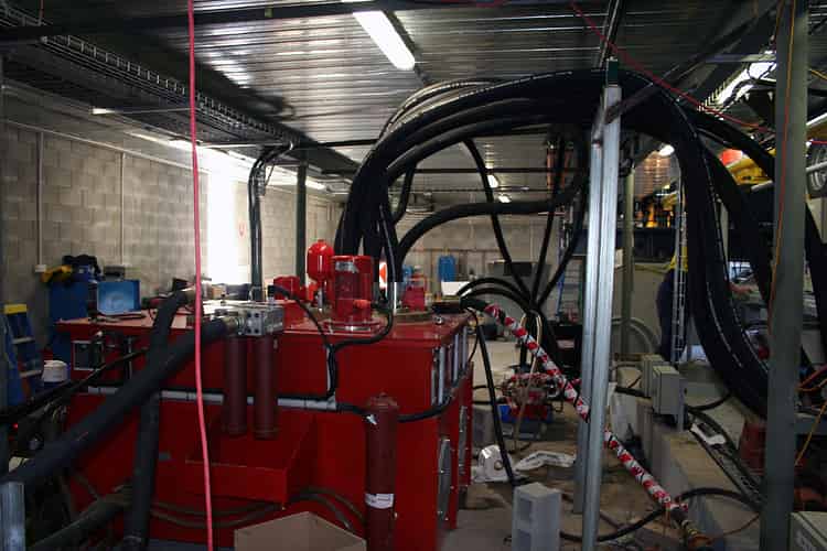 The accumulator system, where compressed hydraulic fluid is pumped to prepare for each launch. This is kept in a separate room from the other components in the back-of-house area due to the nature of the highly compressed gasses and oils used.