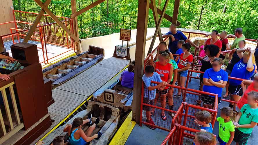 After careful weighing and grouping, riders in sets of five are sent down the slide.