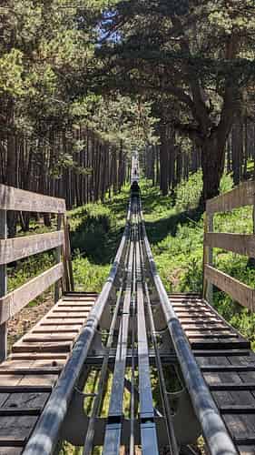 A zipcoaster is a zipline that uses a fixed tubular track instead of rails.