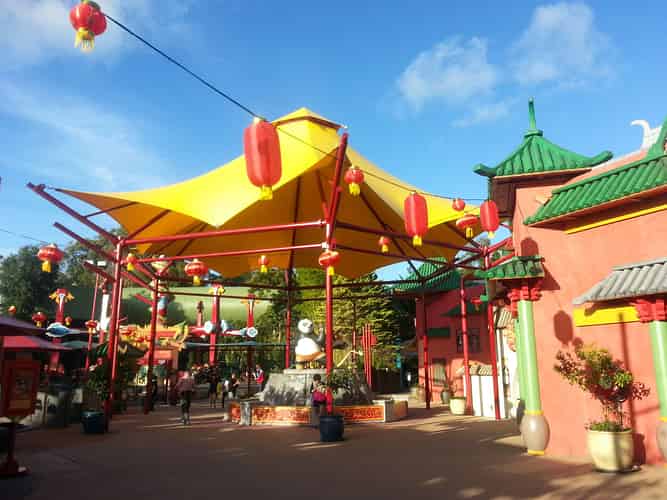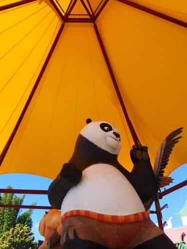 Pandamonium is the flagship attraction of the Kung Fu Panda Land of Awesomness. Guests ride in one of 6 Rickshaws that swing 360 degrees sideways, whilst revolving around a central hub.