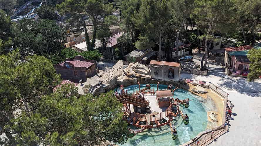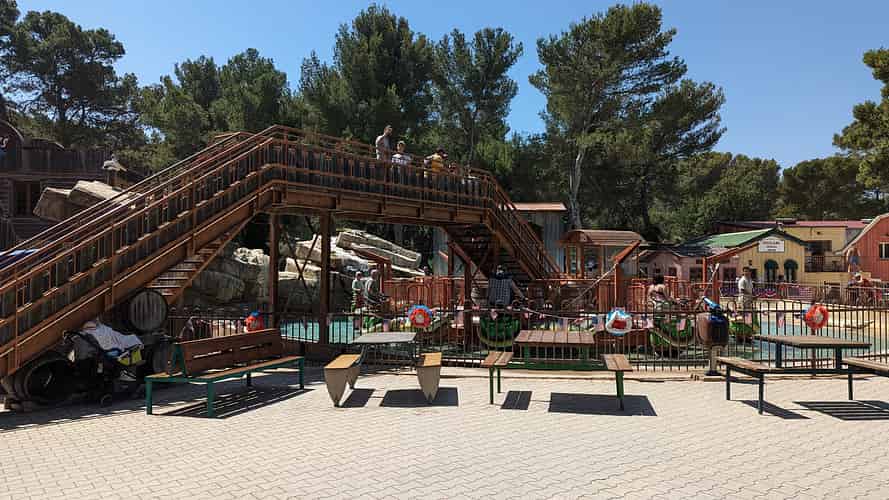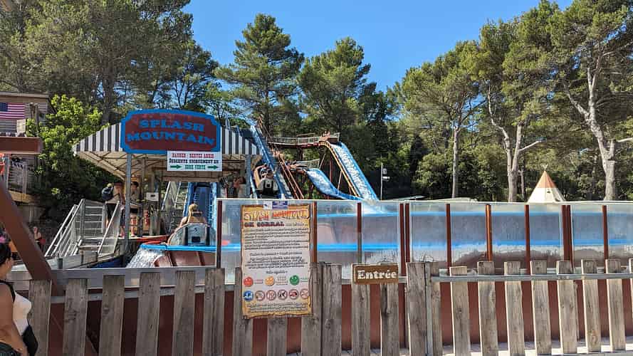 The smaller of the two drop rides is hidden indoors under the giant slide.