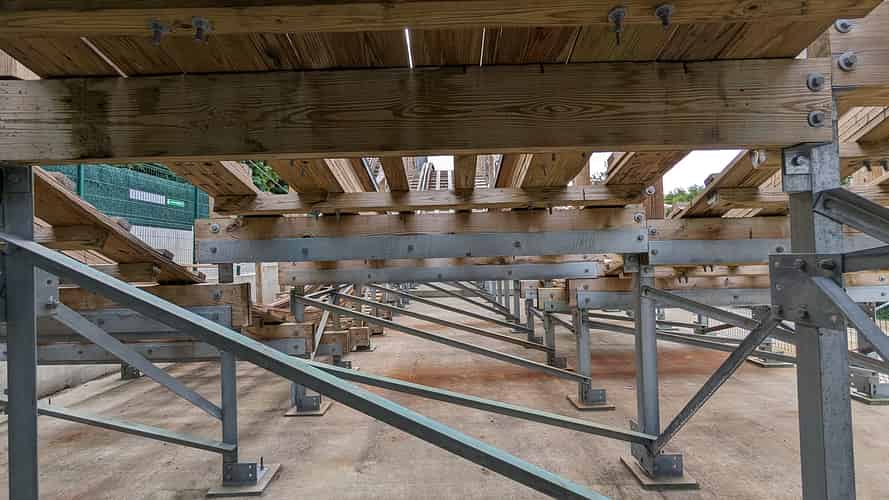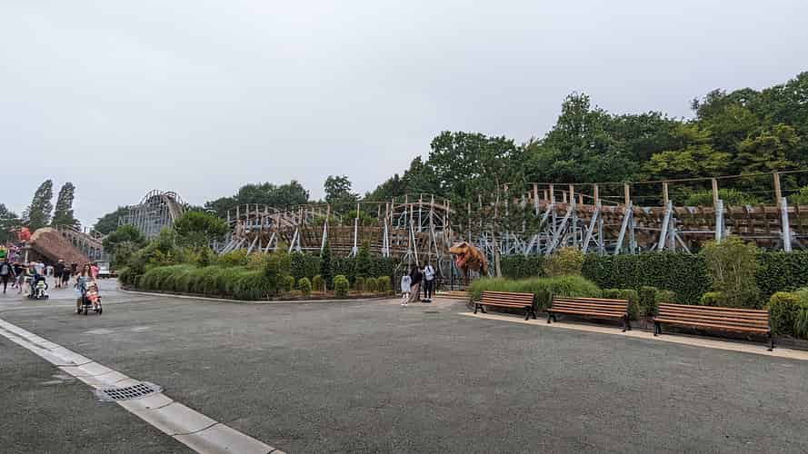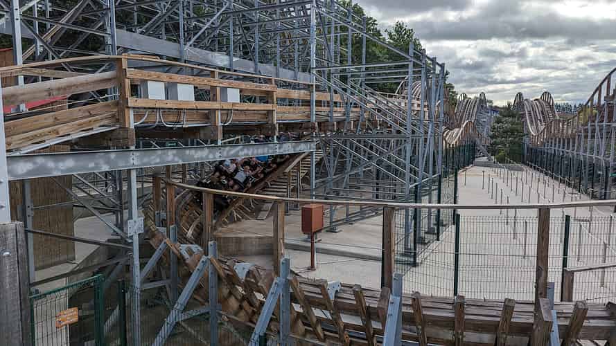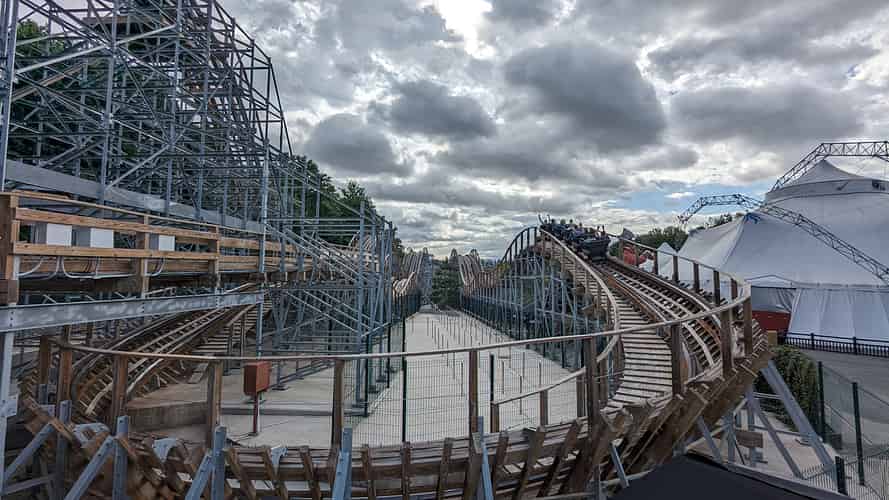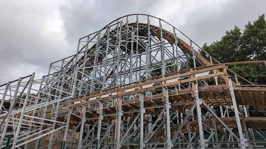 The ride uses layered wooden tracks, built on a steel structure.
