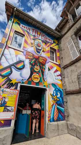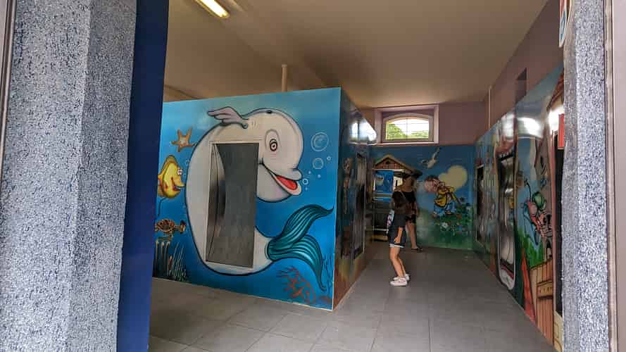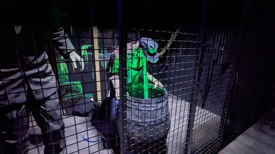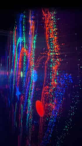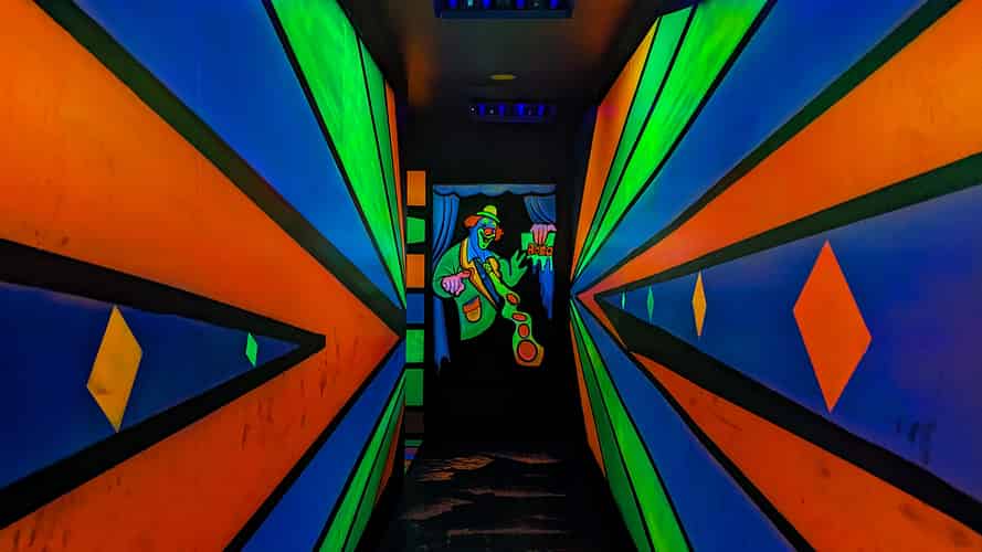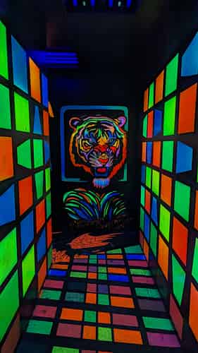 Wearing special chromatic 3D glasses, the paint appears to pop from the walls.