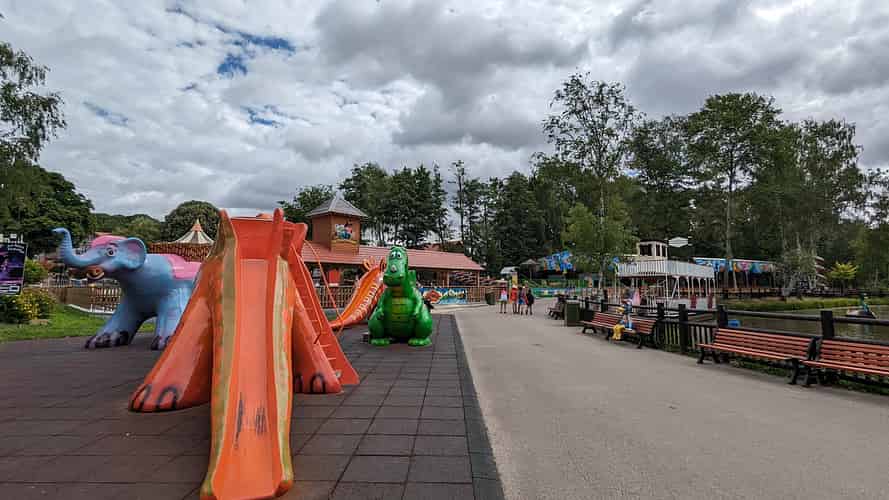 Smaller playgrounds, like this transformer themed one dot the park as well.