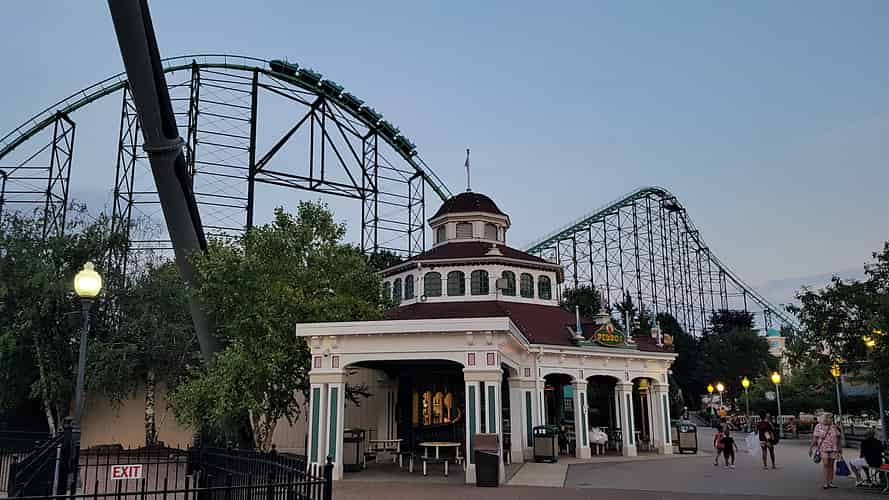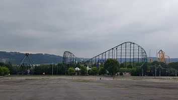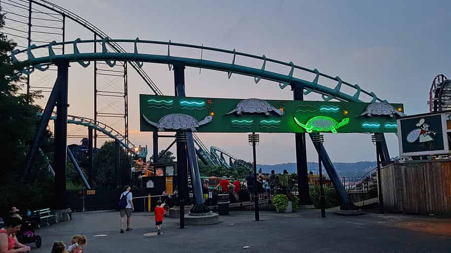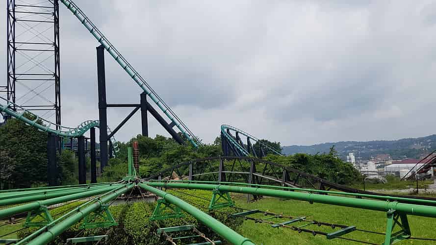 The big drop of Phantom's Revenge seemingly disappearing into the ground, with the Turtles track and arms in the foreground.