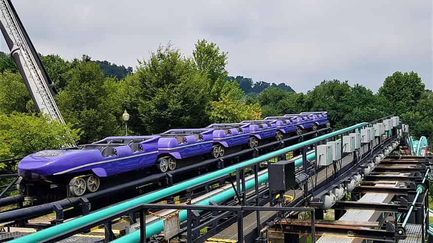 Emerging from the first section, there's the lift hill, and the main part of the ride in view of guests.