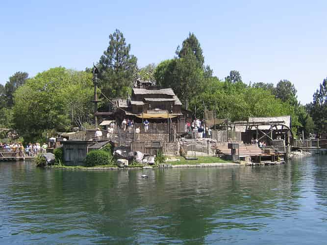 The Pirates of the Carribean building (The one with the flag at the peak) can be seen from Tom Sawyer Island.