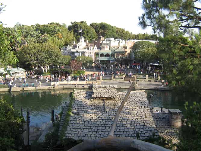 The Pirates of the Carribean building (The one with the flag at the peak) can be seen from Tom Sawyer Island.
