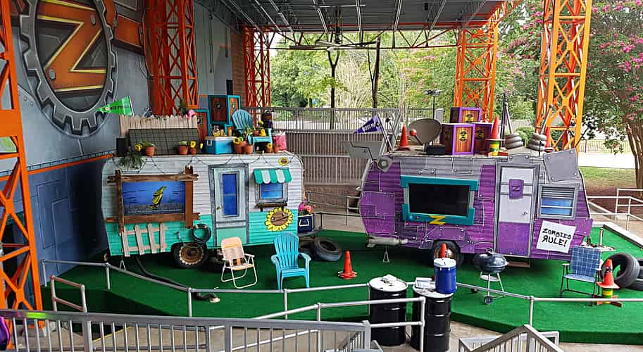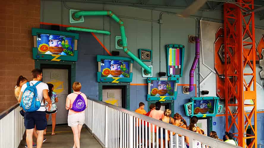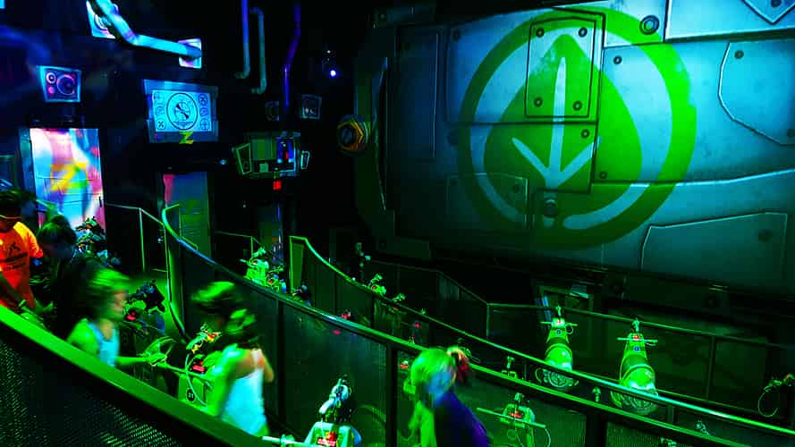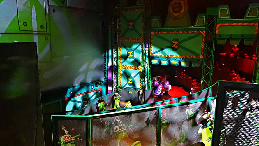 The arena features two screens, with guests divided into the plant and zombie teams. The film is essentially an on the rails type shooter, with all players simultaneously trying to spot their target and shoot at the same time. This, coupled with the fast pace through each "level" does make things quite chaotic.