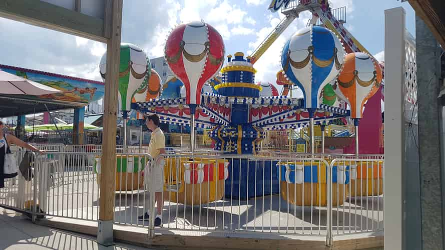 Hot air balloons rotates, tilts, and has individually spinning baskets.