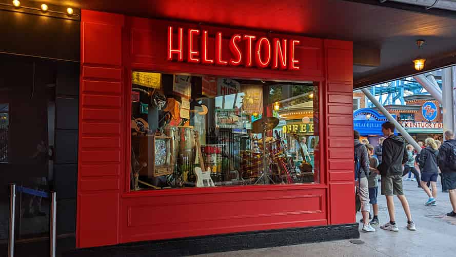 The outside of the ride is incorporated into the streetscape, with record and music store faux shopfronts.