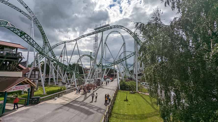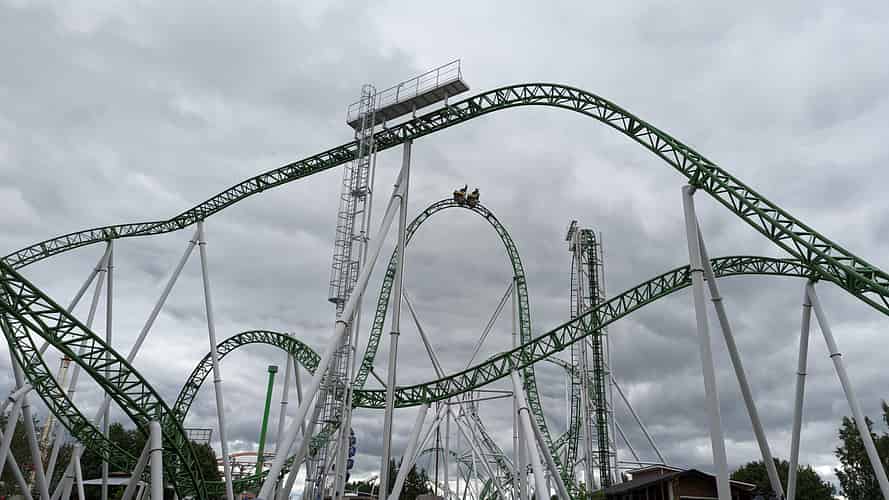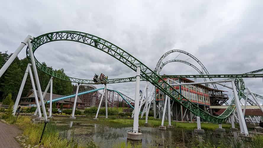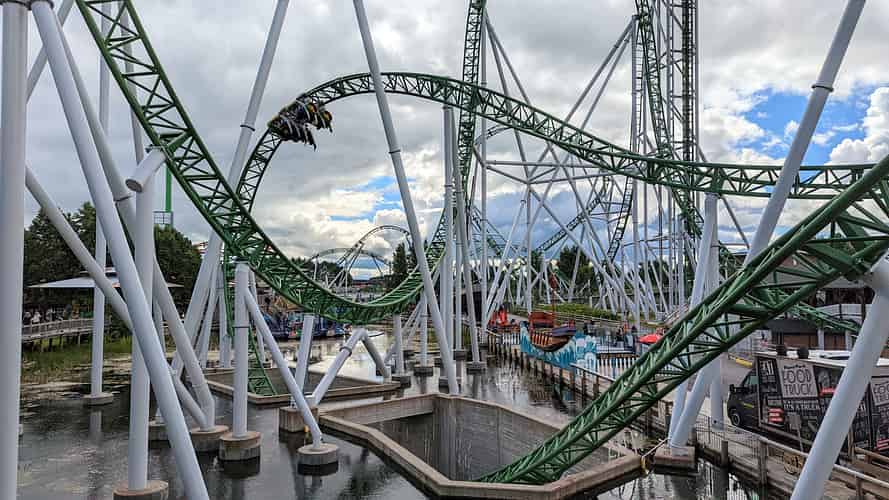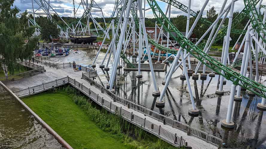 The track passes over the main pathway into a dive loop.