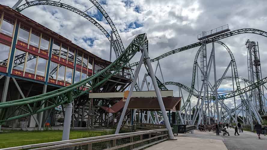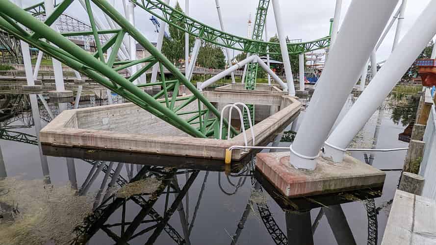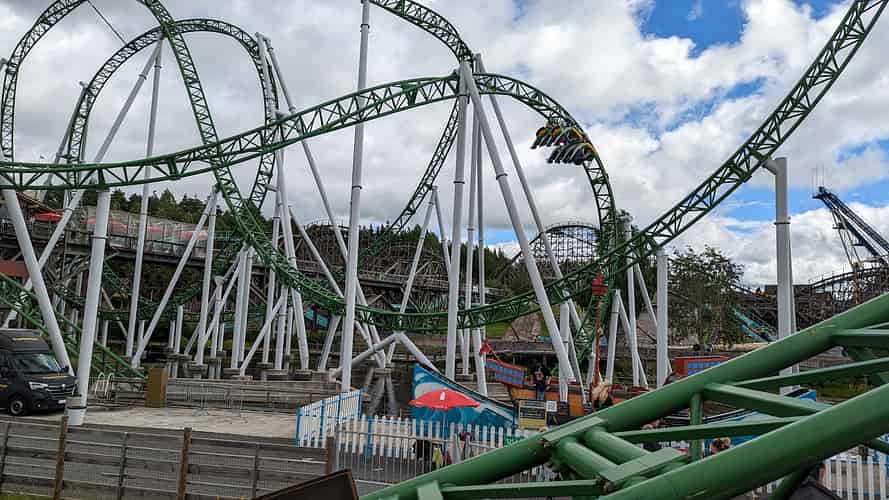 An overview of the layout of Junker (With the lift tower for Pitts special to the left) Confusingly, the park opted to paint both rides the same colour.