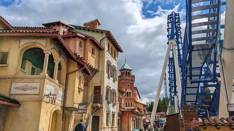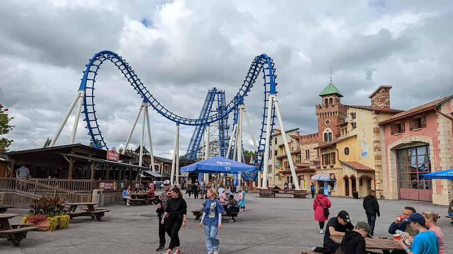 Overloooking Typhoon 360, the Minigolf course, and the Pitts Special roller coaster.
