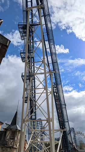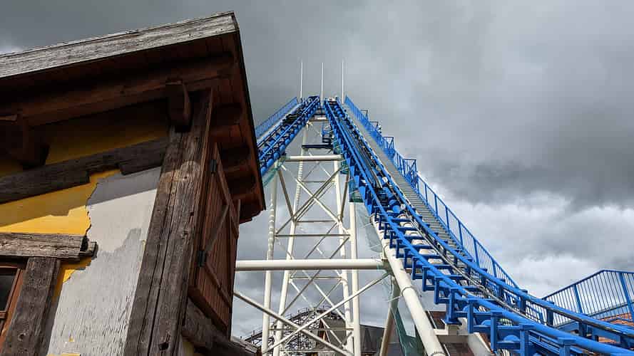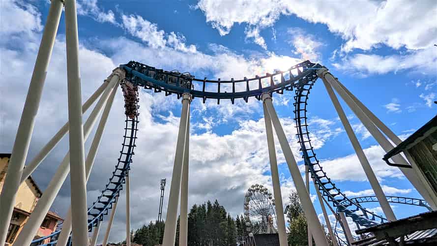 If you are unfamiliar with the ride type, the mode of operation is as follows: The train reverses up the slope on the right, is released and builds up speed running down the slope, passes through 3 inversions, and travels up the slope on the left. The train is caught and brought to the top of this slope, before it is released, and speeds back down the slope, through the 3 inversions, and returns to the start.