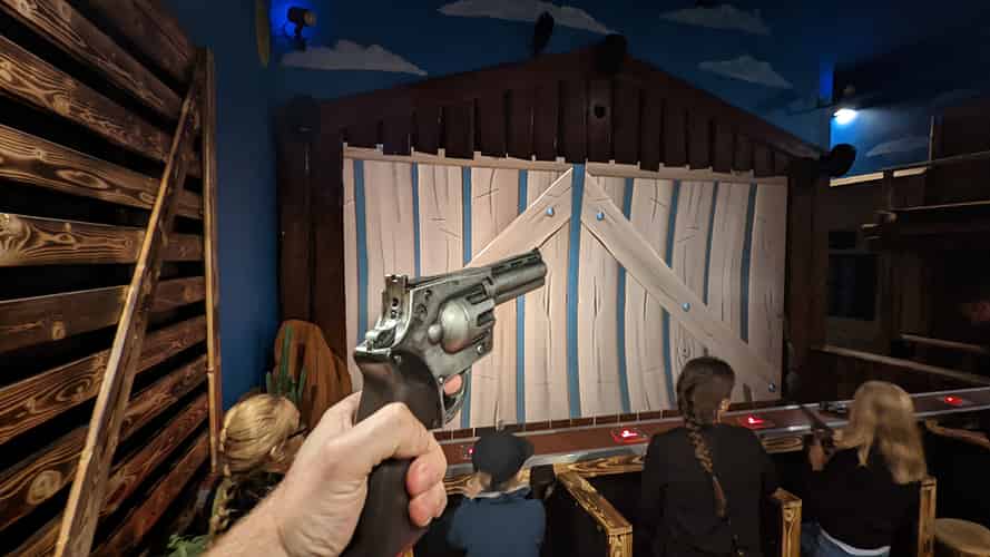 The attraction is a modern take on a shooting gallery, with guests shooting at bottles, bandits and more.