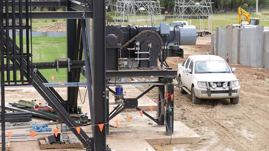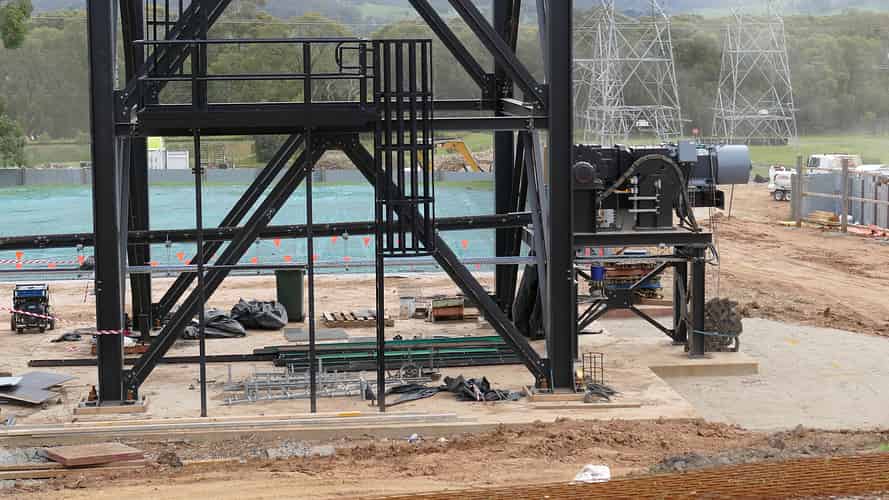 Base of the main lift hill tower, and lift hill motor. The chain is yet to be fully assembled.