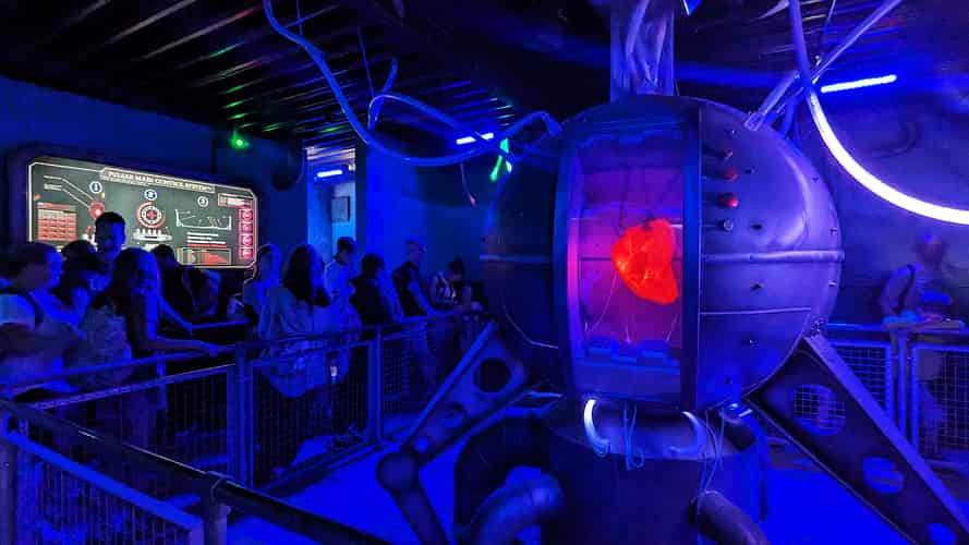 The enclosed section of queue has some pretty abstract theming.