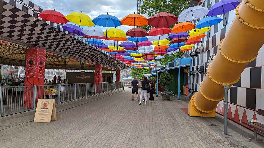 The walkway between Illusionsfabrikken and Radiobilerne, decorated with hundreds of umbrellas.