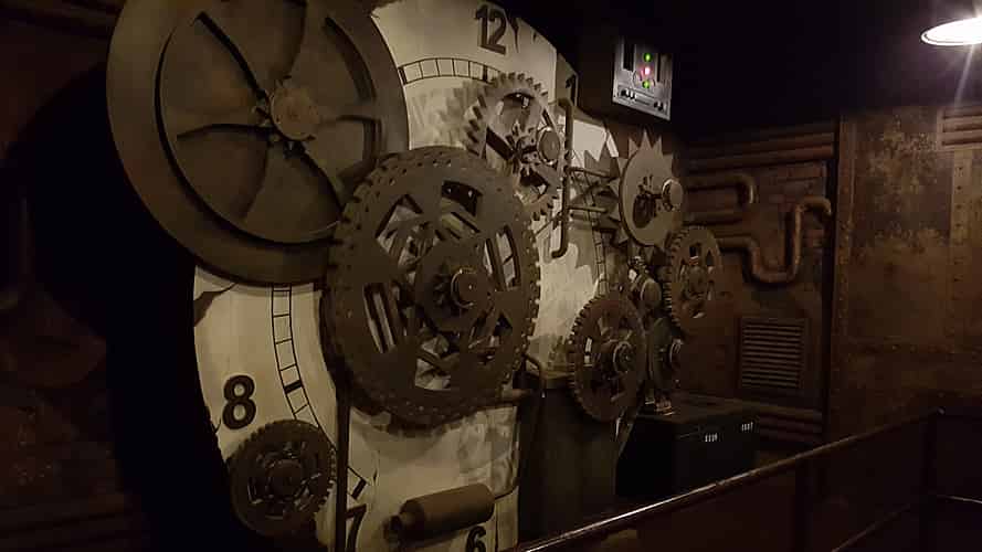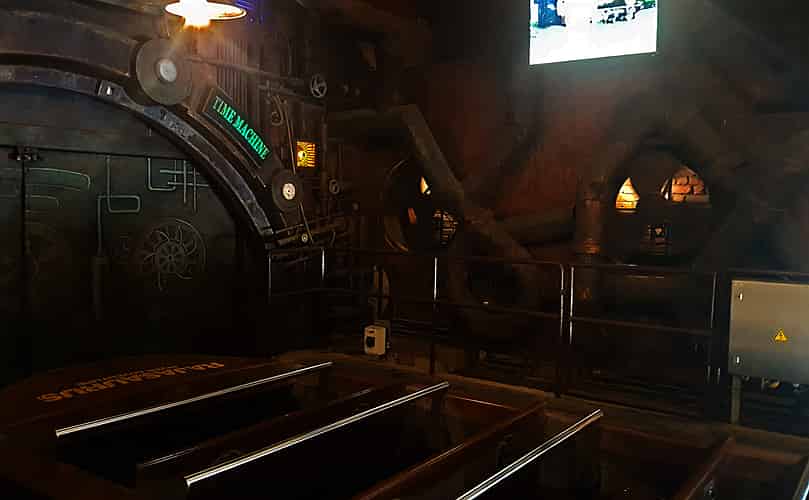 Just as you are about to hop back in your time machine, the Rajasaurus appears, and you drop out from underneath it. The concept borrows heavily from Universals Jurassic Park rides.