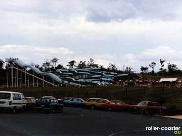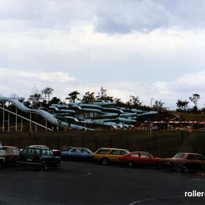 The Speed Slide and bodyslides behind it. The Speed Slide was removed several years ago to make way for Speed Coaster, which uses the same support structure, and the bodyslides structure was filled in to create a hill, becoming White Water Mountain.