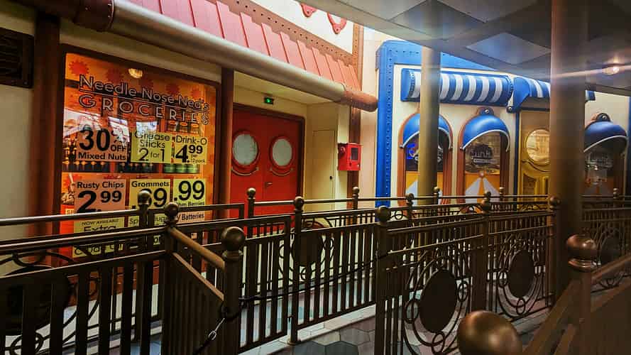 The queue passes a few Rivet Town themed shopfronts.