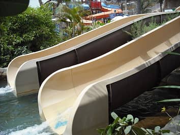 In the foreground are the Thunder Rapids & Rushing Rapids slides. To the right is Juha's Dhow, and in the background is Breakers Bay and the Arabian Gulf.