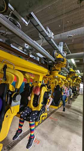 The carriages on this one are longer than most suspended coasters, with 2 rows per car.