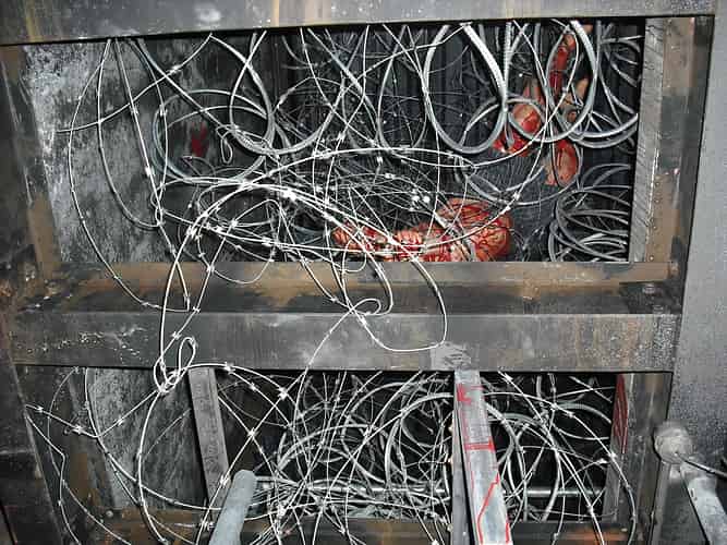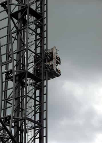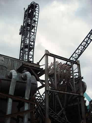 When you reach the highest point you are quickly tipped over the top and sent down a steeper than vertical drop, under a set of spinning blades.